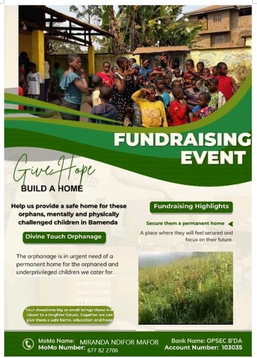 At Divine Touch Orphanage in Bamenda, dozens of orphaned and underprivileged children, some with mental and physical challenges are fighting for a chance to have a roof called theirs over their heads. We have series of affordable LANDS ranging from 700.000frs - 3 million/plot depending on how accessible it is.